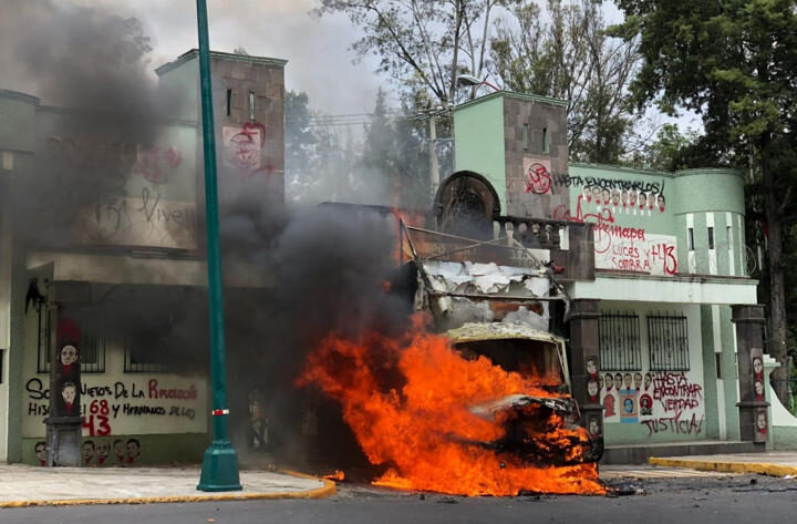 Normalistas prendieron llamas a un camión con el que derribaron la puerta del Campo Militar número 1,...